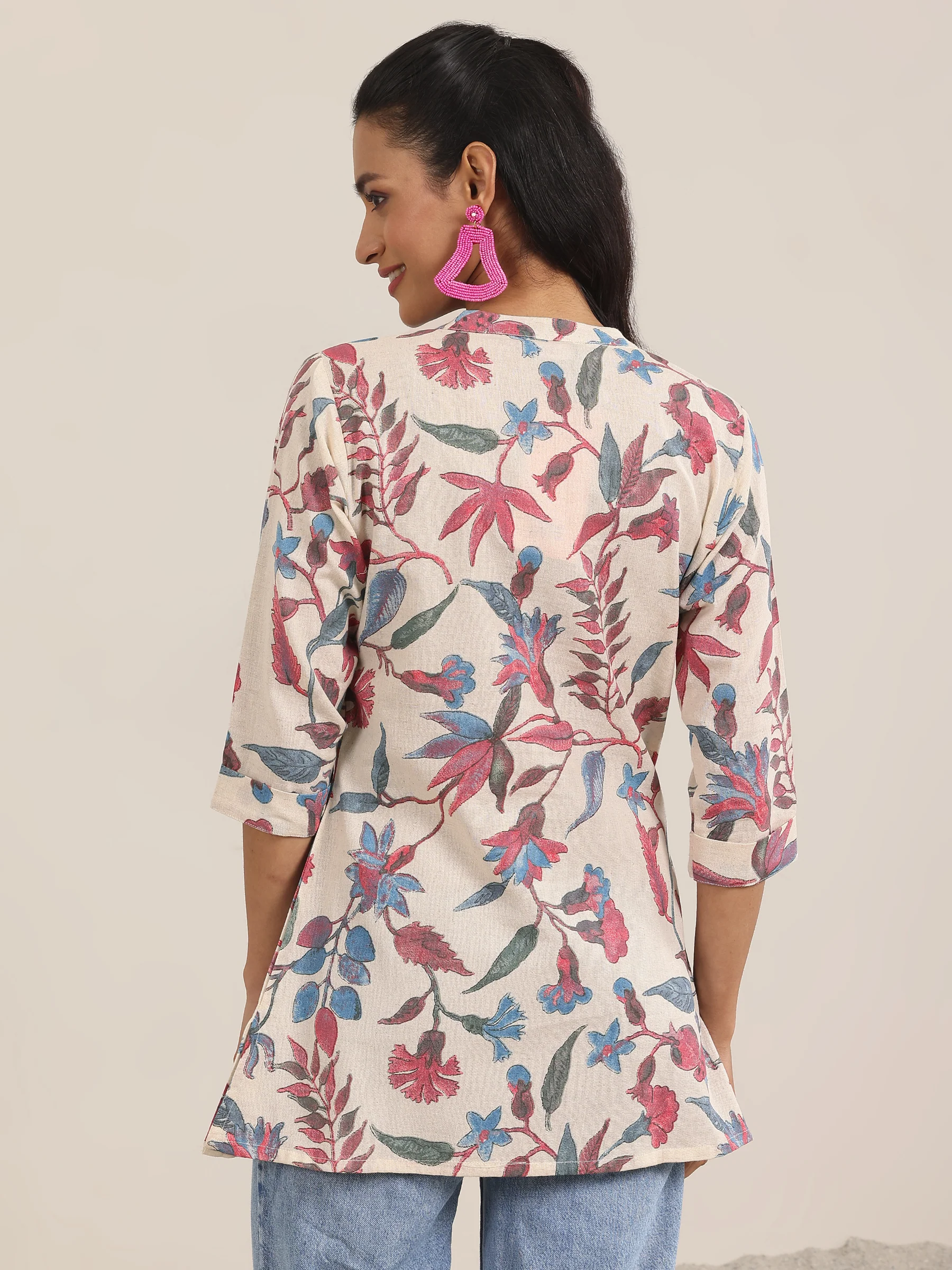 Pink Printed Cotton Straight Short Kurti