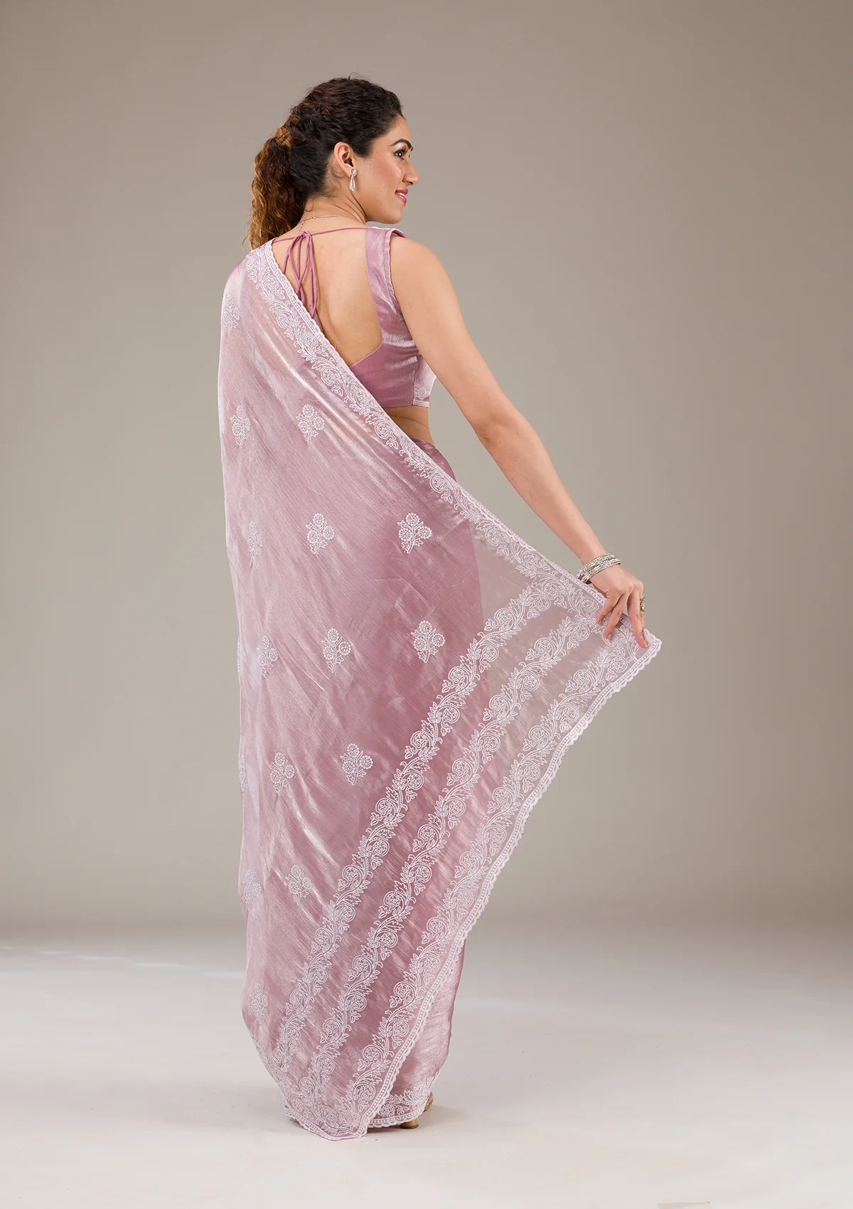 Onion Pink Threadwork Tissue Saree